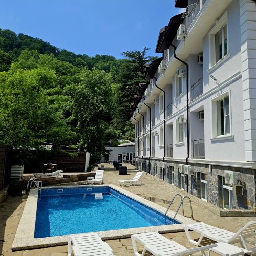 В отеле своя территория, полностью огороженная, без допуска посторонних. На территории есть автостоянка, детская площадка, и тренажеры. Гости могут посетить открытый круглогодично бассейн с зоной отдыха на шезлонгах, есть сауна и мангальная зона.